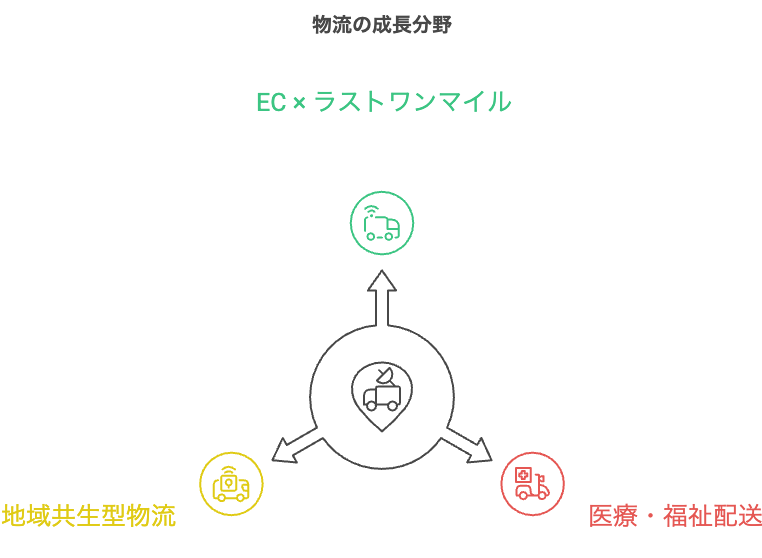 この成長の中心にあるのが「ラストワンマイル配送」。消費者の自宅やオフィスに直接商品を届ける領域は、今後も軽貨物配送を中心に成長が見込まれています。