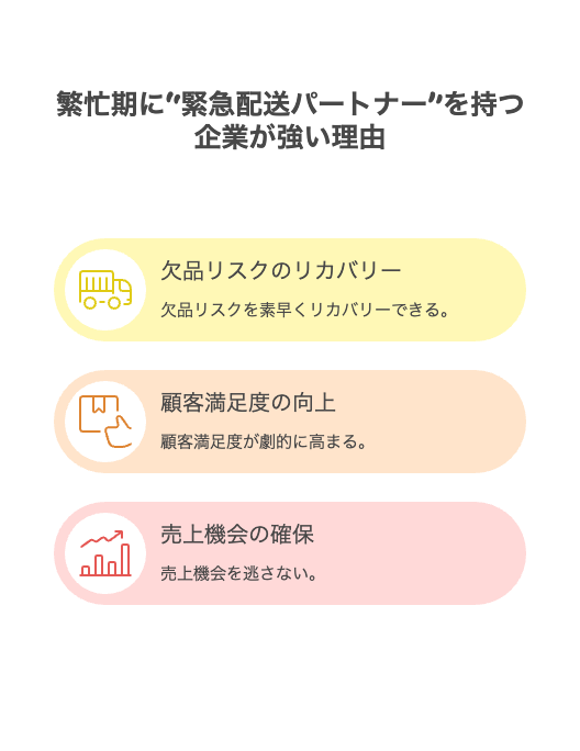 といった 緊急配送ニーズ が急激に増えるのがこのタイミングです。