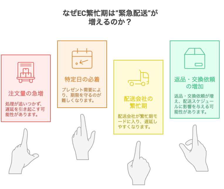 まず、EC業界では繁忙期に緊急配送が増える背景を理解しておく必要があります。