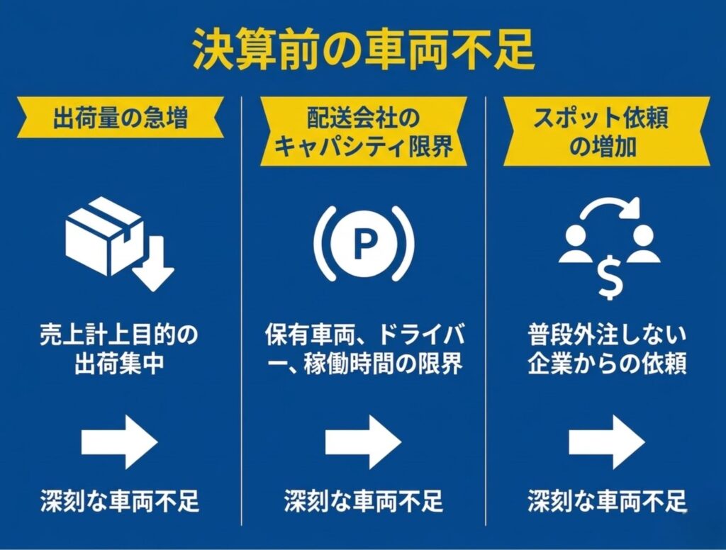 決算前の駆け込み出荷による車両不足は、多くの企業が直面する課題です。