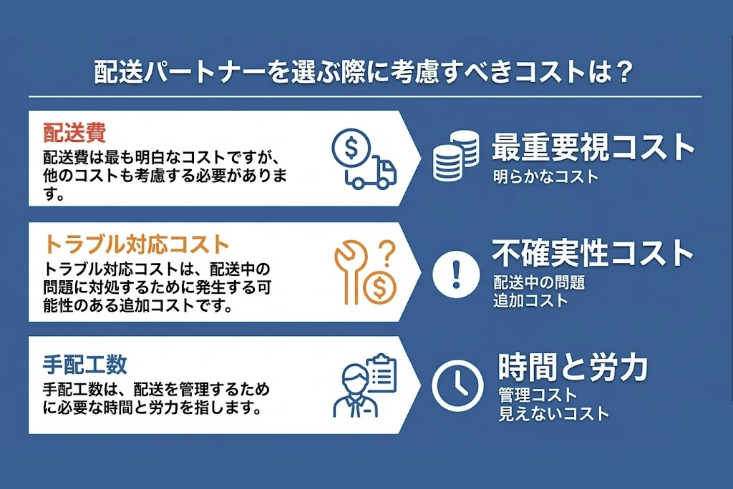 結果的に、クレーム対応や再配送などでコストが増えることもあります。